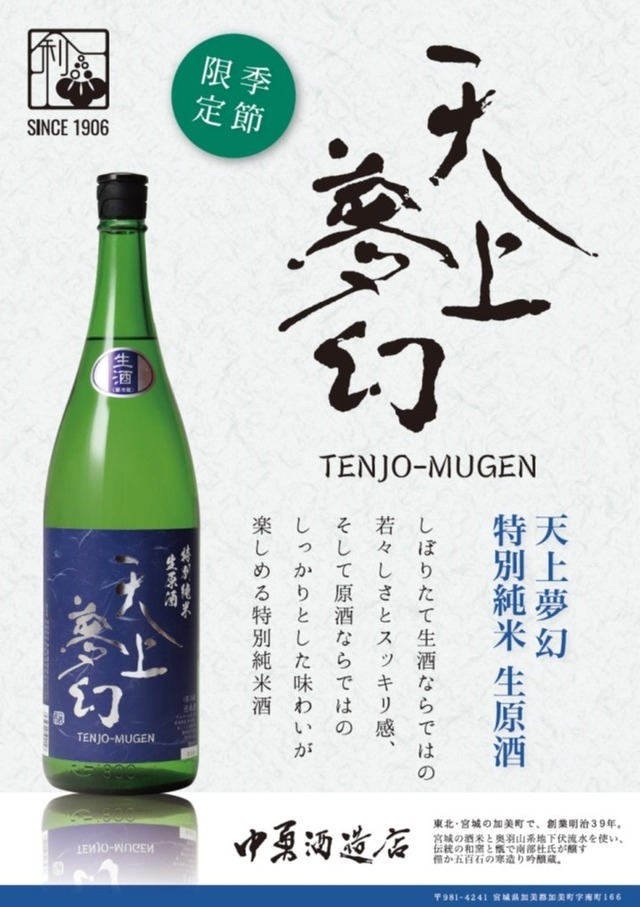 中勇酒造店は1906年、宮城県加美町(旧中新田町)にて創業しました。代表銘柄である「天上夢幻(てんじょうむげん)」は先代当主が趣味であった登山に名も無き試験醸造酒を持参し、山頂で雲海を望みつつ飲んだその一杯に、「天の上で夢か幻を見ているような味わいだ」との一言を登山仲間であった画家の岡部一彦先生より頂戴し誕生しました。天上夢幻は口当たりが優しく、口に含むと米の旨味が感じられる淡麗旨口の酒質をモットーに、高品質少量生産で手造りの地酒を醸しています。また近年では様々な日本酒コンテストでの受賞を果たし、成田・羽田空港国際線ファーストクラス専用ラウンジでの提供酒にも選ばれました。