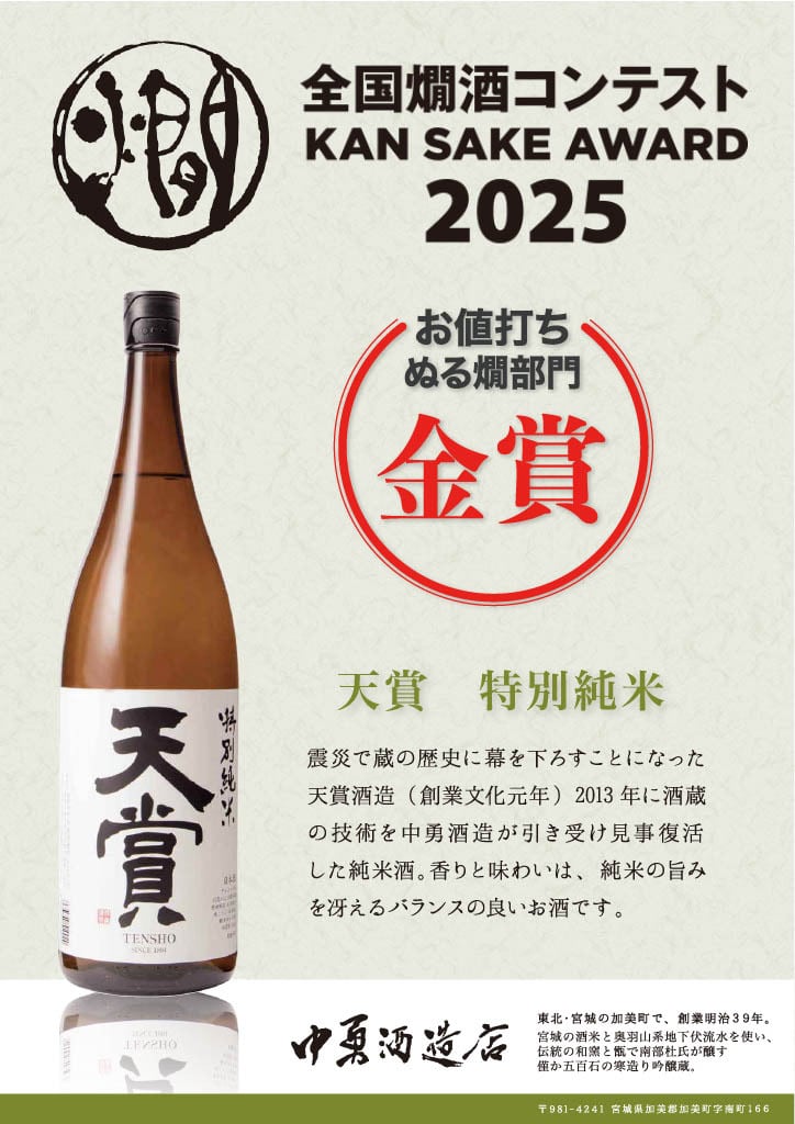震災で蔵の歴史に幕を下ろすことになった天賞酒造(創業文化元年)。2013年に酒蔵の技術を中勇酒造店が継承し、見事復活した純米酒。